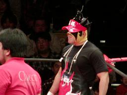 ヘッドバットの打ち合い(右写真)から犬仁田DDOというかDD犬、カウント2。パイルドライバーは柏リバース。