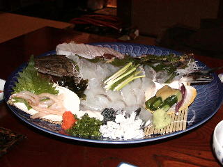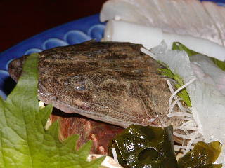 試合後、地元の梁井・柳田と大橋の居酒屋「幸丸」に行く。梁井の行きつけのとこなのだが、かなり珍しい魚が出るというのだ。で、出たのが「こち」の活け造り(右写真)。