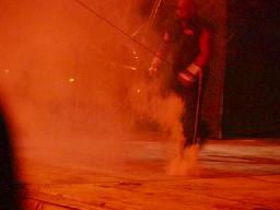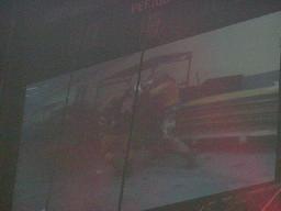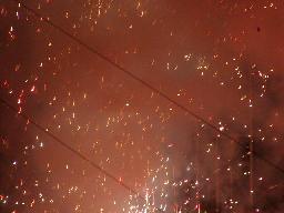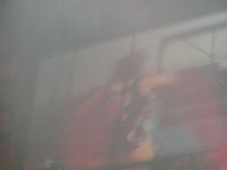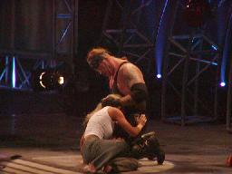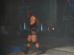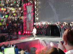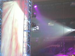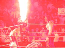 ここで10時。「WAR ZONE」に突入。まずはダドリー・ボーイズにブラザーズ・オブ・デストラクションが挑戦するWWF世界タッグ選手権試合。ケインが入場すると4つのコーナーから火柱(右写真)。やっぱり火を見ると人間興奮するね。