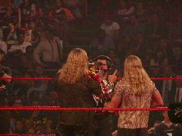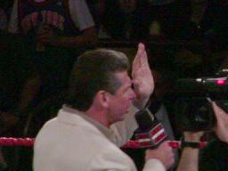 ビンスは自分がなぜいなかったか、にはほとんど触れずに。「ブッカー・Tの『ティー』ってどういう意味だ?お茶のTeaか?それともTeeか?ひょっとしたらtrashの略?もしかしたらtruck野郎の略かな?確かに見た目はそんな感じだな。おっと、もしかしたら“Temporalily employed”(仮採用)の略かもしれんな。どっちにしろWCWは潰れるんだ。今日私は宣言する。このMSGにひとりたりともWCWのレスラーは入れない。このMSGは私の父がWWFを作った大切な場所なのだ。」