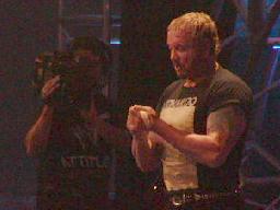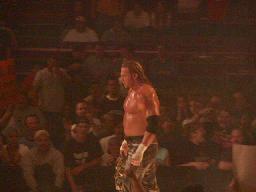 9時35分、リングにはシャツが黒になったスティーヴィー・リチャーズが(左写真)。「私はニューヨークと聞くと必ず3つの言葉を思い出す」とかなんとかニューヨークを非難し始める。