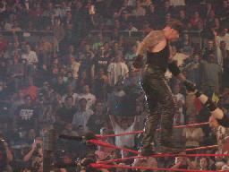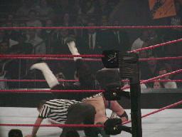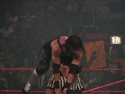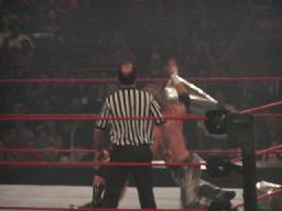 X−パックはコーナーに上り(右写真)場外のジェフにダブルアックスハンドル。リングに戻してカバー、カウント2。X−パックスリーパー、ジェフロープに振る、X−パック切り返す、ジェフ飛びつく、X−パックライガーボムに、カウント2。