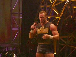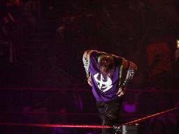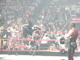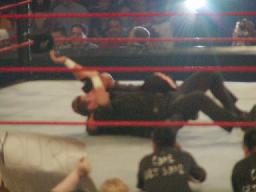 2試合目は昨日のPPVと全く同じカード、ジェフ・ハーディにX−パックが挑むライトヘビー級選手権。ジェフはコーナーに上るとポーズ(右写真)。カッコよい。