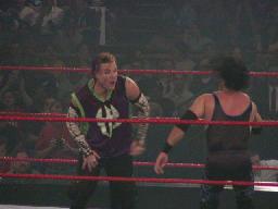 ロープワークからタックル合戦(左写真)、X−パックロープに詰めると早くもブロンコバスター狙う、ジェフかわしてスライディングキックで場外に落とす。すぐにリングに戻して自分はコーナーに。X−パックドロップキックで場外に落とす。