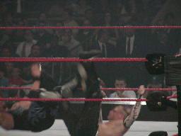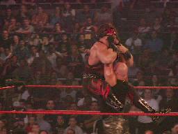 ケインはディーヴォンにビッグブーツ、パワーボム、カウント2。とどめのチョークスラム狙ったところにアルバートが乱入、ケインにボルドー・ボム(右写真)、ディーヴォンがカバー、レフェリー戻ってカウント、3つ叩いてダドリー・ボーイズの防衛。ケインは復活するとアルバートを追ってステージへ消える。テイカーはババ・レイをチョークスラム。