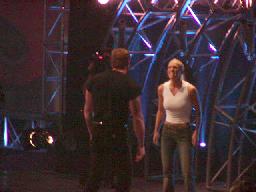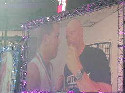 ここでちょっと間が空く。その間もタイタントロンにはロゴが映されている。こうやって後ろから映写してるのね(左写真)。ビンスがオースチンの控室に行き、オースチンがもう少しでベルトを取られそうだったことを責める。しかしオースチンは「My name is Stonecold Steve Austin, I'm a WWF champion and I don't deserve it.」の得意ゼリフから反撃、「2人を相手にWWFの王座を守り抜いたのは他でもない自分だ、その時オーナーであるお前はどこにいた?」ビンス「Calm down, calm down」しかし言葉は返せずヘコむ。するとオースチンの方からビンスをハグ。木曜日は拒否していたビンスも今日はこれに応える。一応2人の関係修復?