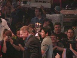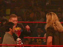 リングに突然赤じゅうたんが敷かれる。「King of te Ring」の表彰式。コミッショナー・リーガルとお付きのTAJIRIがトロフィーを持って入ってくる(右写真)。