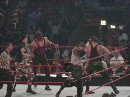 ケインコーナーに振ってエルボー、ババ・レイにもエルボー。ディーヴォンをサイドバスターで叩きつけてコーナーからダイビングラリアット(左写真)、カバーはババ・レイがカット。テイカー入ってババ・レイをパンチ、ラリアットで場外に落とす。レフェリーが場外に降りて2人を制止にかかる。