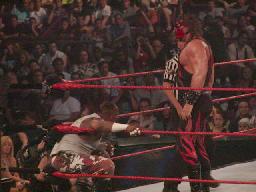ケインはコーナーに詰めてパンチ連打(右写真)、ボディスラムからエルボードロップ、ディーヴォンかわす。ディーヴォンロープに振ってキック、もう一度振る、ケインエルボー。