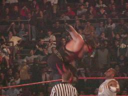 X−パックコーナーに上ってダイビングプレス、ジェフは足を立ててブロック。ジェフコーナーに。場内期待で盛り上がる。その期待に応えてスワントーン・ボム、しかしX−パックかわす。X−パック逆さ押さえ込み、足をロープに掛けて3カウント(右写真)。
