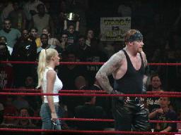 呆気に取られるテイカーとサラ(左写真)。「しかたないか」といった感じで花道を引き上げる。ファンに背中を向けてポーズを取ってると客席からDDPが現れ、イスでテイカーを一撃。