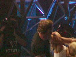 鉄の壁を背にしてフラフラと立ち上がったテストにライノがゴア、そのまま通路でカバーして3カウント。ハードコア王座に並々ならぬ執念を見せるライノが見事王座奪回、と思いきや、WCWのTシャツを着た男が角材持ってライノに襲い掛かる。誰?(後で調べたらマイク・アッサムだった)アッサムはライノを角材で殴り付け、さらにラダーの上にライノをパワーボム、レフェリーにカウント入れるよう命令。3カウントが入る。「Where's MY belt? Where's MY belt?」アッサムがベルトをひったくって走り去る。ハードコア王座がWCWに流出?