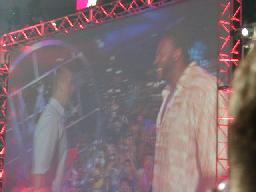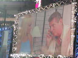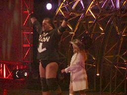 マット・ハーディwithリタがリングに。マットはコーナー上、リタはリングでテーマ曲に合わせて踊る(左写真)。ハーディ・ボーイズとリタの人気はほんとに凄い。