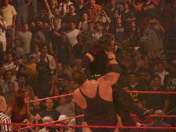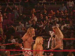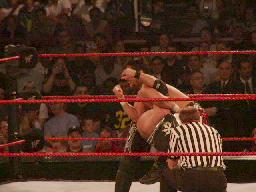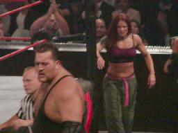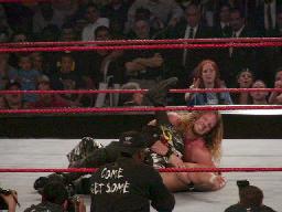 リタがなんとかマットを助けようとするがビッグショーには近づけない(右写真)。ビッグショーがマットをリングに戻す。ロープに振って横蹴り、エルボードロップはマットかわす。マットロープにつかまって立つ。そこにトリッシュが近づきマットにいきなりキス。これを見たリタが怒り狂ってトリッシュを場外に落とすとキャットファイト。
