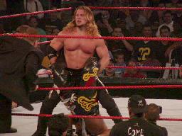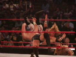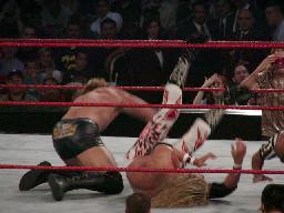 ロープに振る、ビリー切り返す、エッジゼロ戦キック(左写真)。エッジパンチ打ち込んでコーナーに上るとミサイルキック、カウント2。エッジロープに飛ぶ、ビリーキャッチしてスパインバスターに。場外に出す。