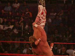 ビリーロープに飛ぶ、クリスチャンがリング下から足引っ張る。エッジは高角度DDT(左写真。「バズ・キラー」と名前がついた)でビリーをピンフォール。