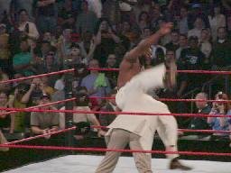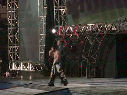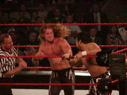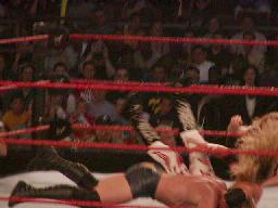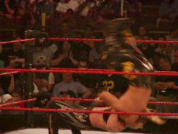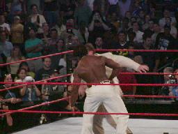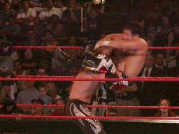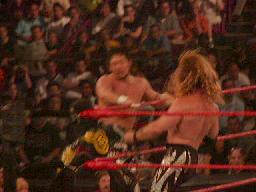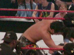 TAJIRIコーナーに振る、ジェリコ切り返す、TAJIRIエプロンに出て、突っ込んできたジェリコにハイキック(右写真)。コーナーに上って後頭部にミサイルキック、カウント2。TAJIRIロープに振ってキック、延髄蹴り。ジェリコエルボー、ラリアット、逆水平、倒れたTAJIRIの顔面にドロップキック。