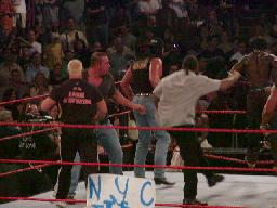 オースチン控室でこの映像を見ると「I don't deserve this...」ビンス「WWF・NYなんてほんの何ブロックしか離れてない。行ってkick assだ!」と煽動する。デブラ「行っちゃダメよ。」オースチンはビンスに「お前も行くんだろ?」ビンス「え?私?私は・・・・」オースチンはアングルに「よおタフガイ、お前はどうだ?」アングルしばし考えて「Let's go!」結局ビンスは行かない。この時点で10時20分。