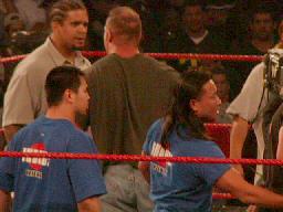 コミッショナー室。リーガルが「ジェリコを痛い目に遭わせねば・・・ハンディキャップにするか・・・・」と悩んでるとTAJIRIが日本語で「それなら俺にやらせてくださいよ。あんな奴チョロいチョロい。OK?OK?」リーガルが勢いに押されて「OK」と言うと「やったー!決定!決定ーい!」とリーガルの判をそこらじゅうにつきまくる。
