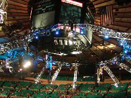 高級クラブメンバー用指定席「スカイボックス」からアリーナを見下ろす。今日のRAWのためにWWFご自慢の照明セットを吊り上げんとするところ(左写真)。