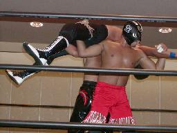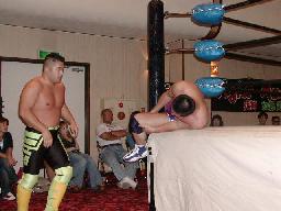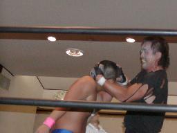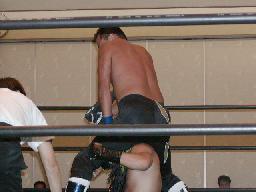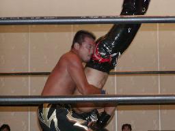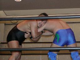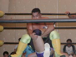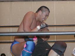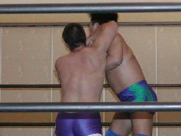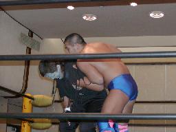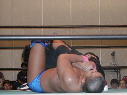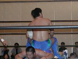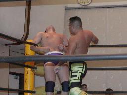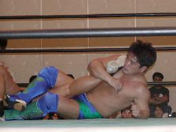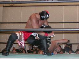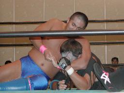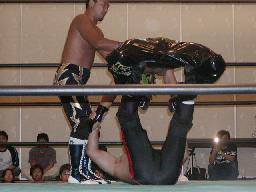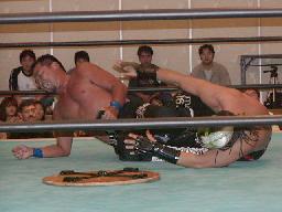 大作十字に、死神ブロックしてエビ固め、カウント1。大作また十字狙う、死神またエビ固めに、今度は2カウント。死神キック、ヘッドロック。大作ロープに振る、死神タックル、大作倒れない。死神フライングメイヤー、大作ヘッドシザーズでブレーク。大作ヒザ蹴りからヘッドロック、死神ロープに振ろうとするが大作グリップを放さずそのままグラウンドヘッドロックに(右写真)。死神立ち上がってアトミックドロップ、大作それでも放さない。死神バックドロップ、大作まだ放さない。死神根負けしてロープエスケープ。そのまま場外に。5分経過。