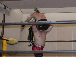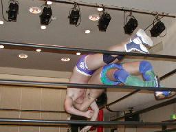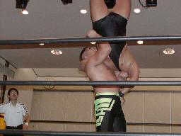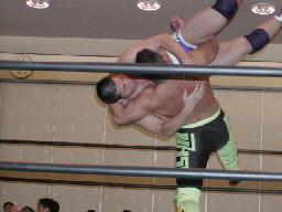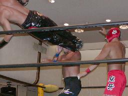 加藤と茂木はダブルのスパインバスター、茂木すかさず吊り天井に(右写真)。回転して持ち上げるたびに加藤がMASAMUNEのボディにパンチ。茂木カベルナリアに、MASAMUNEはサミングでブレーク。茂木ワンハンドバックブリーカー、ストンピング。ブレーンバスターの体勢で持ち上げてトップロープにボディからぶつける。5分経過。