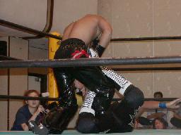ロックアップ、大作ロープに押し込んでブレーク。再度ロックアップ、大作腕をひねる(左写真)。死神切り返すが大作すぐにまた切り返す。死神ロープ。死神ハンマーロックに。大作切り返す。死神ホイップで投げるが大作もすぐホイップで投げてアームロック。