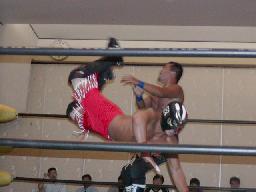 クーガーサイドスープレックスからカバー、カウント2。クーガーネッククラッチ。首投げからスリーパー、加藤ロープ。クーガーはMASAMUNEにタッチ。MASAMUNEコーナーからダブルアックスハンドル。加藤をコーナーに振り、自分はセカンドロープに飛び乗ってソバット、これは当たり弱く「企画倒れ」の感。ブレーンバスターからカバー、カウント2。MASAMUNE十字に、加藤エビに切り返す、カウント2。加藤ネックロック、これがチョークに取られる。MASAMUNEキック、加藤をコーナーに押し込んでクーガーにタッチ。クーガーロープに振ってドロップキック(右写真)。