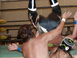 大作死神をコーナーに振って突っ込む、死神体を伏せて大作を顔面からターンバックルに突っ込ませるとラ・マヒストラル(左写真)、カウント3。