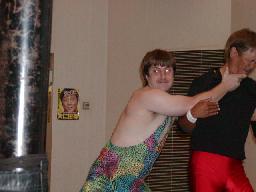 I AM MORIが入場すると、I AM CODYが突然襲撃(右写真)。CODYマイク取って「何だよこれ?I AM MORIって誰だ?足立出て来い!」とか主張する。足立出てくる。「MORIと試合したいの?じゃ、CODYを長瀬館長の方に入れて3vs2に。俺の独断で変更する。」
