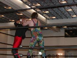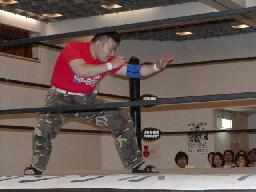 クーガーは森谷の首をエプロンから出すとロープ越えギロチン(左写真)。飛田はエプロンに出るとクーガーにカーフブランディング。これは昨日の秋山の技??Qoo飛田にプランチャ。10分経過。