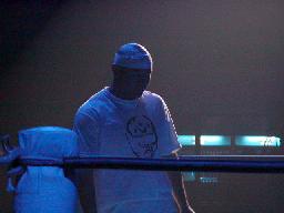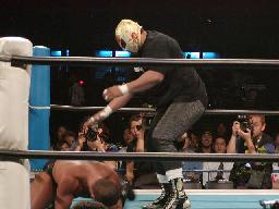 コブラがシャツ着たままで先制攻撃(左写真)、村上を場外に落とす。コブラは村上を客席に投げ込むとリングに戻る。