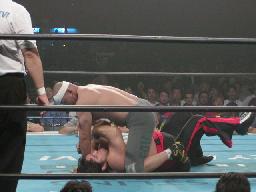 高岩キャメルクラッチ(左写真)、これで決まってもおかしくないような反り方だったが佐藤はロープ。