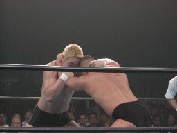 佐藤エクスプロイダー(?)狙うが高岩ブロックしてラリアットから逆エビ(右写真)、佐藤ロープ。