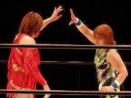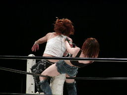 輝コーナーに上る、日向追いかけてコーナーに上りスパイダージャーマン狙う。輝が抵抗するとコーナーの上で腕を極めにかかる日向(右写真)。