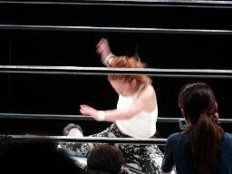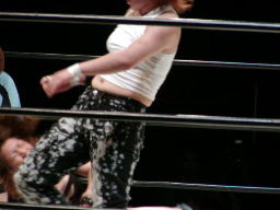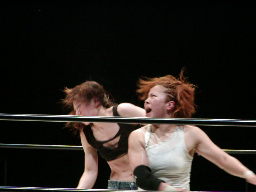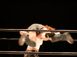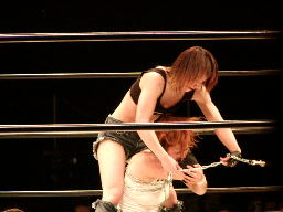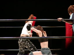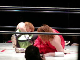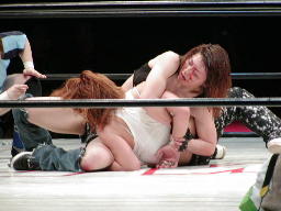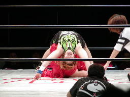 この辺りでデジカメ電池切れにより写真撮れず。リングに戻って倉垣バックドロップ、コーナーに上る。高橋雪崩式ブレーンバスター狙うが倉垣はヘッドバットで突き落としてミサイルキック。ロープに振る、高橋カウンターのショルダータックル、倉垣場外転落。高橋トペ・スイシーダ。リングに戻って雪崩式ブレーンバスター、カウント2。高橋コーナーに上ってダイビングプレス、倉垣かわしてウィングクラッチホールド(右写真)、カウント2。倉垣バックドロップ、カウント2。ムーンサルト、これも2。倉垣突っ込む、高橋カウンターのラリアットからナナラッカ、カウント3。