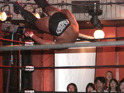 ハブ影はロープを利用したパロ・スペシャルに(右写真)。鳥羽がコーナーに上ってカットしようとするがハブ影が大家に乗っかって揺らしたため落下、股間をトップロープに強打。