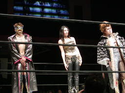 佐々木抗議するかと思ったら2人でポーズ(左写真)。不思議なタッグだ。2人で蛇影にストンピング、ようやく外れる。ポイズンをダブルでロープに振る、スーザンが妨害。ポイズン2人にラリアット、宇宙にタッチ。