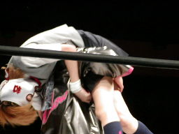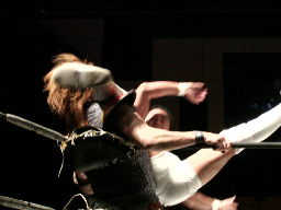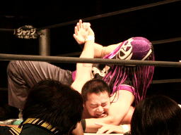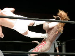 宇宙が「昭和」子にストンピング、コーナーに振る、「昭和」子コーナーに飛び乗ってウルトラ・ウラカン・ラナ(左写真)。宇宙はポイズンにタッチ。