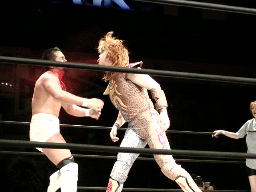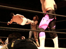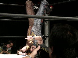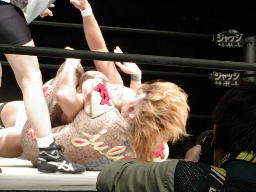 宇宙逆エビ固め、GENTAROがカット(右写真)。宇宙はGENTAROを場外に放り出す。ポイズンにタッチ。