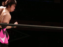 ポイズンと宇宙ダブルチョップ、ポイズンロープに振ってニールキックからヘビープルズ・エルボー。ポイズンコーナーに振る、佐々木コーナーに飛び乗って飛びつきスイングDDT、GENTAROにタッチ。GENTAROネックブリーカードロップ、パンチ連発からボディスラム、セカンドコーナーに上ってダイビングエルボードロップ(右写真)、佐々木にタッチ。