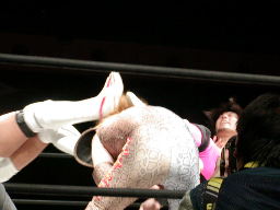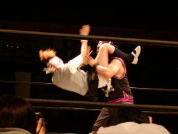 宇宙佐々木にラリアット、GENTAROはコーナーに振って串刺しラリアット。GENTAROをラストライドに(右写真)、一発目は回転エビに切り返されるがすぐに二発目、「昭和」子がカット。10分経過。