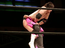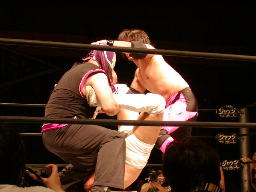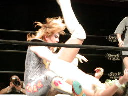 宇宙入って佐々木にキック、長滞空時間ブレーンバスター(右写真)、カウント2。5分経過。