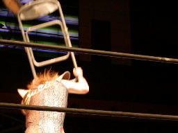 ポイズンがイスを持ち込む。ロープに振ってイス、佐々木かわす。佐々木イスを取り上げてポイズンの頭に、ポイズンキャッチして逆に佐々木に一撃、イスの底が抜ける。ポイズンそのまま底の抜けたイスで佐々木を連打(右写真)。ポイズンチョークスラム、佐々木ブロックしてDDT、延髄蹴り打ってGENTAROにタッチ。