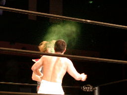 佐々木D-ガイスト狙う、ポイズン着地。佐々木が振り返ったところに緑のミスト(右写真)。しかし佐々木はすぐにラリアット。