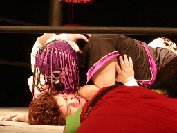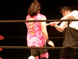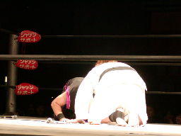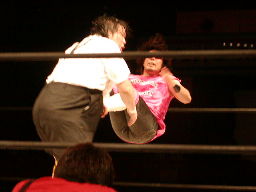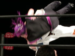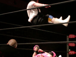 両者チョップ合戦、GENTAROラリアット、カウントは1。両者ダウン状態。グレースがカウント開始。蛇ダーがグレースにリバースDDT、カウントを強制的に中止。金村はGENTAROをコーナーに振ってスプラッシュ、GENTAROかわしてスウィート・チン・ミュージック(右写真)、カバー、グレースなんとかカウントを入れるが2。