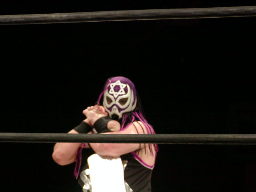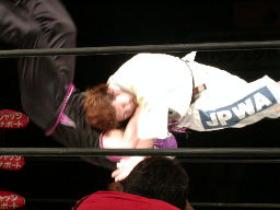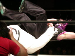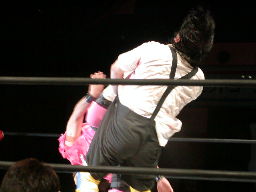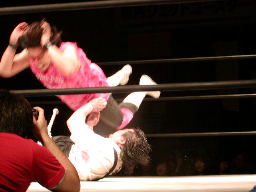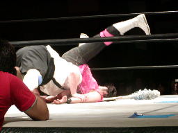 金村コーナーに上る、GENTARO起き上がるとグレースをコーナーに突き飛ばす、この衝撃で金村は足を踏み外して股間を強打。GENTAROコーナーに上って雪崩式フランケン(左写真)、カウント2。GENTARO後ろ向きにコーナーに上る、金村起き上がって雪崩式バックドロップ。15分経過。