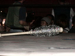 リング上には公認凶器の有刺鉄線バット(右写真)。スクランブルバンクハウス方式でバットの取り合いからスタート。