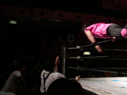 GENTARO机の破片持ってコーナーに上る。金村起き上がる、GENTARO机の破片投げつける、金村キャッチ、そこにGENTAROミサイルキック(左写真)、カウント2。