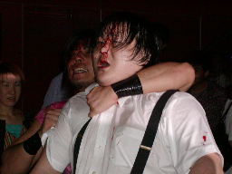 場外では蛇ダーも竹刀で攻撃。金村はGENTAROの額にバットを押し付けて流血させる(右写真)。
